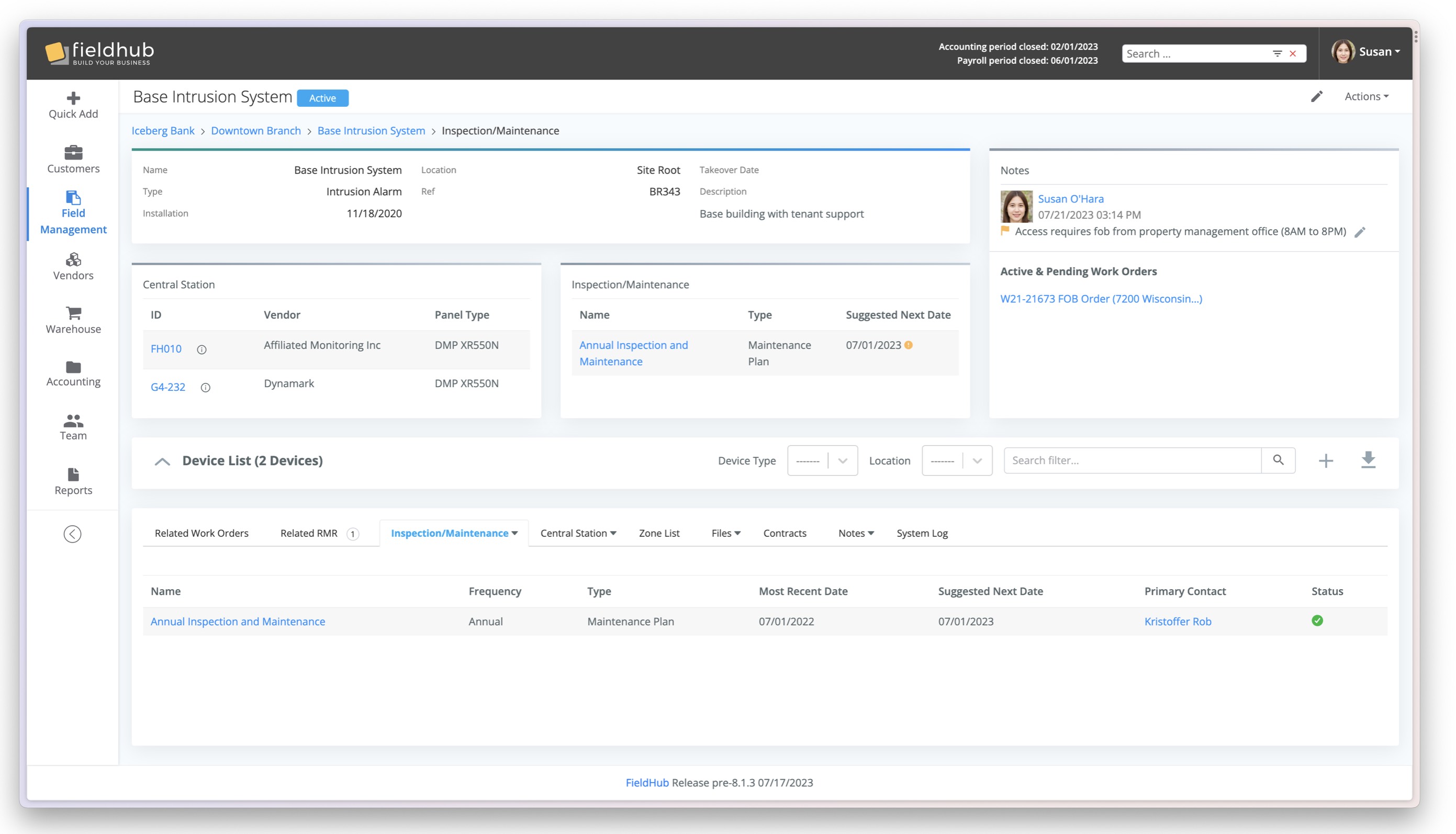 Our Systems Management feature tracks central station connections, periodic inspections and maintenance schedules, and device details, including device types, warranty information, locations, serial numbers, and device-specific data such as MAC and IP addresses. This level of detail ensures you have the information you need to efficiently manage your systems and devices.